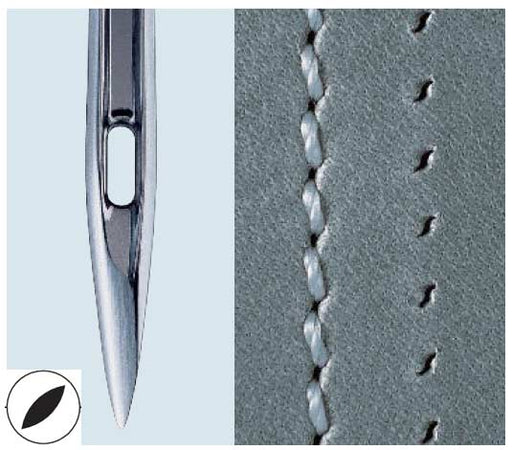 Package of 10 needles. Made in Japan.Needle System: 135x8LR (DPx8LR)Needle Point: LRApplication: Leather (light, medium, heavy)Seam Appearance: To ...