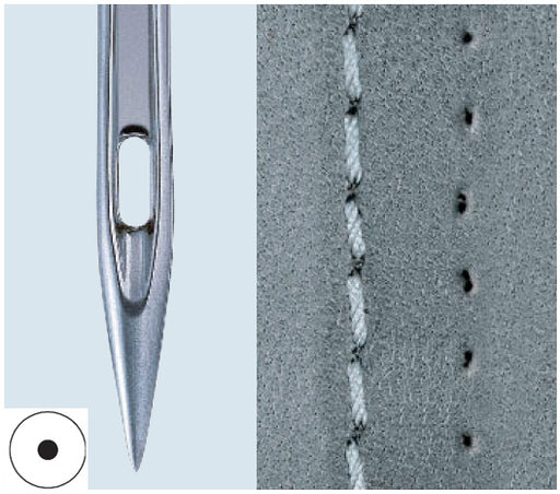 Package of 10 needles. Made in Japan.Needle System: 135x8LR (DPx8LR)Needle Point: LRApplication: Leather (light, medium, heavy)Seam Appearance: To ...